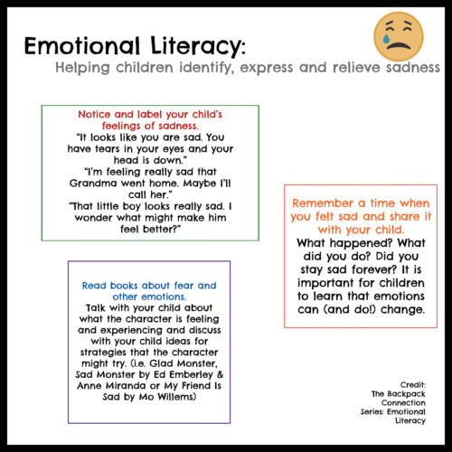 Sadness is one of the easiest emotions for young children to understand. Everyone feels sad at times for a variety of reasons. As parents, we want to encourage our children to recognize when they are feeling sad and take steps to help themselves feel better or, if needed, ask someone else for help. Sometimes simply acknowledging your child’s sadness is all that is needed. The graphic below gives examples of how to best help your littles identify and process sadness for themselves.