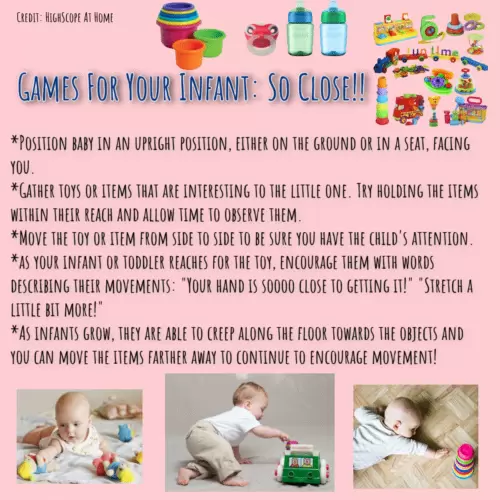 News and EventsSites NewsSo Close!!! Play time for our littlest friends today! So Close! is a fun game to play with infants and toddlers of any age to promote first movements or encourage physical activity in mobile babies! Have fun!! #CFR #HighScopeAtHome #LearnThroughPlay #PromotingHealthyHabits Categories: News and Events, Sites News Share this post Share on FacebookShare on Facebook Share on XShare on X Pin itShare on Pinterest Share on LinkedInShare on LinkedIn Post navigationPreviousPrevious post:Nutrition & Exercise During PregnancyNextNext post:Best Sources of Vitamin C!Recent News and EventsNJ Family Care InformationMarch 30, 2023We’re Hiring!January 11, 2023FCC – Internet Service Discount ProgramMay 11, 2022Early Childhood Development: Cause and EffectApril 6, 2022Making Life Easier: Bedtime & NaptimeMarch 28, 2022Best Sources of Vitamin C!March 24, 2022